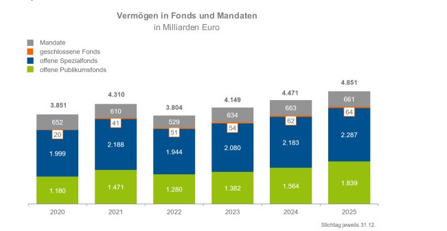 Die Fondsgesellschaften verwalteten zum Jahresende 2025 für Anleger in Deutschland 4.851 Mrd. Euro. Den größten Teil managen offene Spezialfonds für institutionelle Investoren mit 2.287 Mrd. Euro. Hierzu gehören vor allem Altersvorsorgeeinrichtungen (813 Mrd. Euro) und Versicherer (536 Mrd. Euro). In offenen Publikumsfonds verwalten Fondsgesellschaften 1.839 Mrd. Euro, in Mandaten 661 Mrd. Euro. Geschlossene Fonds kommen auf 64 Mrd. Euro.