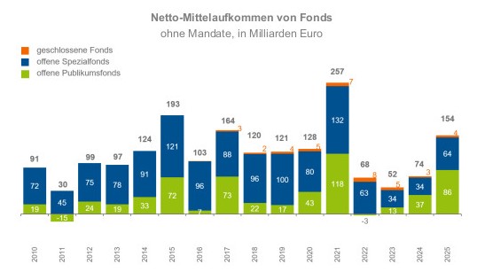 Im letzten Jahr flossen Investmentfonds netto 154 Mrd. Euro zu. Auf offene Publikumsfonds entfallen 86 Mrd. Euro, allein 57 Mrd. Euro in Aktien- und Renten-ETFs. 2026 setzte sich dieser Trend mit einem positiven Jahresstart fort.