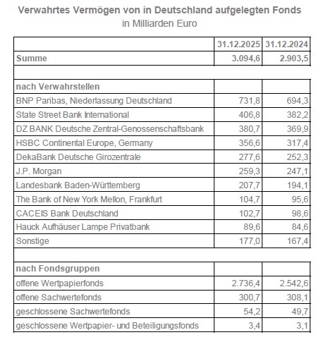 Die Depotbanken verwahrten zum Jahresende 2025 insgesamt 3.095 Mrd. Euro für in Deutschland aufgelegte Fonds. Das sind über 6% mehr als zum Ende des Vorjahres (2.904 Mrd. Euro).