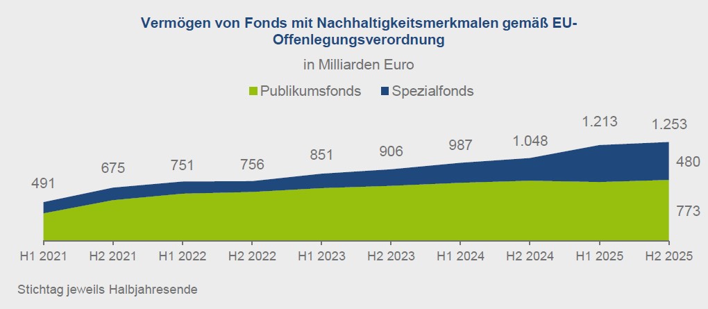 Nach Daten des BVI belief sich das in Deutschland verwaltete Vermögen von Fonds gemäß Artikel 8 und 9 der EU-Offenlegungsverordnung (SFDR) per Ende 2025 auf rund 1.250 Mrd. Euro. Das Wachstum fiel jedoch moderat aus: Spezialfonds legten um 2,8% auf 480 Mrd. Euro zu, Publikumsfonds um 3,6% auf 773 Mrd. Euro. Ein Großteil dieses Anstiegs ist auf positive Kapitalmarkteffekte zurückzuführen, nicht auf frische Mittelzuflüsse.
