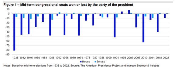 Die Mehrheit der Republikaner in beiden Kammern des US-Kongresses hat es Präsident Trump ermöglicht, seine politische Agenda umzusetzen. Am 3. November 2026 finden in den USA jedoch Zwischenwahlen statt, bei denen die Partei des Präsidenten in der Regel Sitze in beiden Kammern verliert (sh. folgende Abbildung). Die einzigen Ausnahmen von dieser Regel für das Repräsentantenhaus waren die zweite Amtszeit von Bill Clinton und die erste Amtszeit von George W. Bush (als beide in den Gallup-Umfragen Zustimmungswerte von über 60% hatten). Dass das Repräsentantenhaus an die Demokraten geht, ist praktisch Konsens (die Republikaner haben nur 220 Sitze, also nur zwei mehr als die für eine Mehrheit erforderlichen 218 Sitze). Ein Kontrollwechsel im Senat erscheint schwieriger, da die Demokraten hier vier der 22 zur Wahl stehenden Sitze der Republikaner gewinnen müssten (nur 35 der 100 Senatoren stehen 2026 zur Wiederwahl). Das ist eine große Hürde. Angesichts sinkender Umfragewerte könnte Präsident Trump 2026 verstärkt auf machtpolitische Initiativen setzen, um die Abkehr von den Republikanern aufzuhalten – Beispiele sind Venezuela, Grönland oder die ins Spiel gebrachte Aufstockung des Verteidigungsetats um 50%.