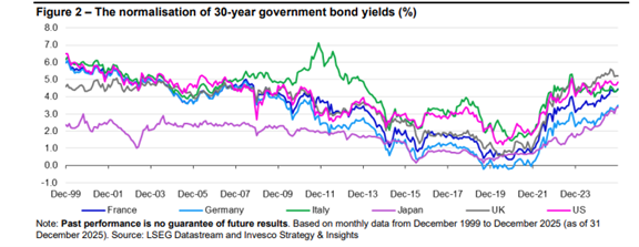 Nach den Tiefständen im Nachgang der globalen Finanzkrise und Pandemie scheinen sich die Renditen 30-jähriger Staatsanleihen wieder auf einem normaleren, höheren Niveau eingependelt zu haben (sh. folgende Abbildung). Ob sie inzwischen wieder die langfristige Norm erreicht haben, ist schwer zu sagen. Ich vermute jedoch, dass sie nicht mehr weit davon entfernt sind (basierend auf geläufigen Annahmen zum langfristigen nominalen BIP-Wachstum und angemessenen Laufzeitprämien). Außerdem hat es einige interessante relative Bewegungen gegeben: Die Renditen japanischer Staatsanleihen haben zu denen deutscher Bundesanleihen aufgeschlossen; die Rendite französischer Staatsanleihen liegt jetzt näher an der ihrer italienischen als ihrer deutschen Pendants, und US-Staatsanleihen rentieren wieder höher als italienische Staatsanleihen. Am höchsten ist die Rendite in Großbritannien mit 5,12% (Stand 9. Januar). Trotz der politischen Instabilität gehe ich davon aus, dass 30-jährige britischer Staatsanleihen Ende 2026 tiefer rentieren werden als ihre US-Pendants. Erstens sind die langfristigen Zinsen in Großbritannien häufig niedriger als in den USA, was ich angesichts des voraussichtlich schwächeren langfristigen nominalen BIP-Wachstums in Großbritannien aktuell auch für angemessen halte. Zweitens erscheint die Haushaltslage der USA prekärer als die Großbritanniens, insbesondere angesichts der Regierungsbemühungen, die Popularität der Republikaner vor den Zwischenwahlen zu steigern (siehe die kürzlich vorgeschlagene Erhöhung der Verteidigungsausgaben um 50%). Das könnte zu einem Anstieg der langfristigen Renditen in den USA führen.