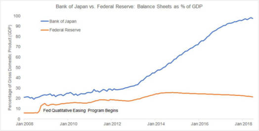 Am Montag, den 30. Juli, bestätigte die Bank of Japan (BOJ) ihre Entschlossenheit zur Ankurbelung ihrer Wirtschaft, indem sie ihre „YCC“-Politik (Yield Curve Control), die sich verpflichtet, die Rendite ihrer 10-jährigen Anleihen - JGBs - mit allen möglichen Mitteln nahe Null zu halten, beibehielt. Die einzige Abweichung: die Erweiterung der zulässigen Rendite um lediglich zehn Basispunkte von 0,10% auf 0,20%. Das Ergebnis ihrer jahrelangen Stimulierungspolitik war, dass die Bestände der BOJ an Anleihen und Aktien auf fast die Größe ihrer Gesamtwirtschaft angewachsen sind - weit entfernt von den rund 22% des BIP der Fed.