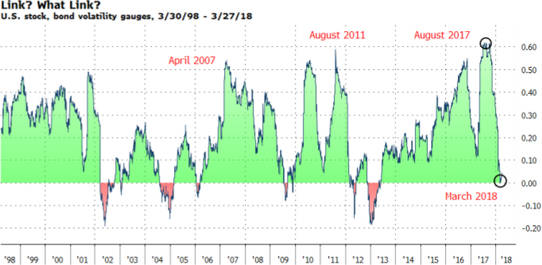 In diesem Jahr ist jedoch die Korrelation zwischen den Volatilitäten selbst - zumindest bei US-Aktien und US-Anleihen - nahezu verschwunden. Am 27. März 2018 erreichte die 120-Tage-Korrelation zwischen dem CBOE VIX Index und dem MOVE Index für festverzinsliche Wertpapiere einen Wert von 0,037. Dies deutet darauf hin, dass in den letzten 120 Tagen fast keinerlei Beziehung zwischen den beiden Maßen bestand. Der geringe Korrelationswert impliziert, dass jedes von ihnen als Puffer gegen die Volatilität des anderen gedient haben könnte - zumindest über die letzten 120 Handelstage hinweg. Noch im August und September 2017 lag die Korrelation auf einem 5-Jahres-Hoch und erreichte ein Niveau von 0,614 - deutlich höher als während der Finanzkrise 2007/08. Der Höhepunkt nach der Krise von 0,5874 wurde im August 2011 erreicht, als die USA von Standard and Poor’s inmitten eines politischen Showdowns herabgestuft wurden.
