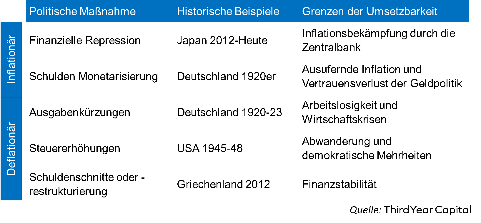 Die Politik handelt ergebnisorientiert mit dem Ziel, einen kurzfristigen Abbau oder zumindest eine Stabilisierung der Schuldenlast ohne weitreichende ökonomische und soziale Risiken zu erzeugen. Inflationäre und deflationäre Gefahren lauern für Gesellschaft und Investoren als Konsequenz bei jeder Maßnahme – ein politischer Drahtseilakt. Gemäß historischer Analysen stehen der Politik generell die folgenden fünf Maßnahmen zur Verfügung: