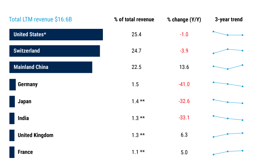 Gemessen am Umsatz schrumpft der Anteil der USA jedoch auf fast die Hälfte – immer noch groß, aber nicht mehr so beunruhigend. Auf der anderen Seite springen die Schwellenländer (EMs) von etwas mehr als 10% nach Unternehmenssitz auf etwa 40% nach Umsatz.