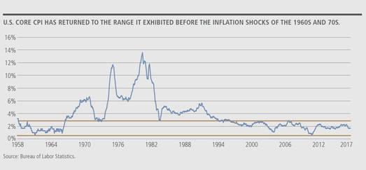 Ein Grund dürfte das verhaltene Lohnwachstum der letzten Jahre sein: Laut Internationalem Währungsfonds stagniert es bei rund 2% p.a. Doch wie lange noch? Hinweise liefert die Analyse der Phillips-Kurve in den USA der 1960er Jahre: Das Jahrzehnt begann mit einer hohen Arbeitslosigkeit, die dann stetig zurückging. Die Auswirkung auf die Kerninflationsrate im Verbraucherpreisindex blieb jedoch bis 1966 gering. Danach verdoppelte sich die Inflation und die Teuerungsraten blieben bis Mitte der 1990er Jahre hoch. Heute zeigt die Verlaufskurve eine ähnliche Ausgangssituation wie vor dem Inflationsschub der 70er Jahre. Womöglich lässt eine Arbeitslosenquote von 4,0 oder 3,5% die Preise wieder steigen. Auslöser dafür könnten etwa die Anreize der US-Steuerreform sein.