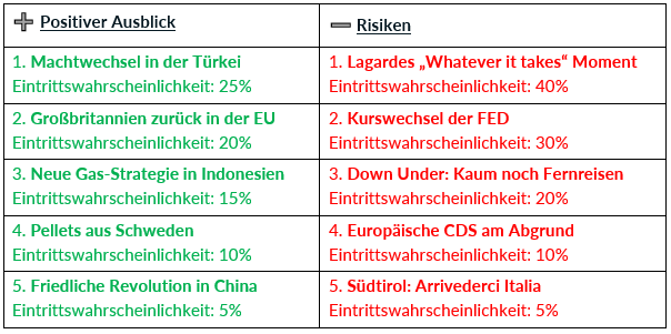 Nachfolgend finden Sie in der Tabelle zunächst die jeweils fünf (un)mögliche Risiken und fünf Chancen in der Übersicht und darunter die Erläuterungen zu den einzelnen Punkten.