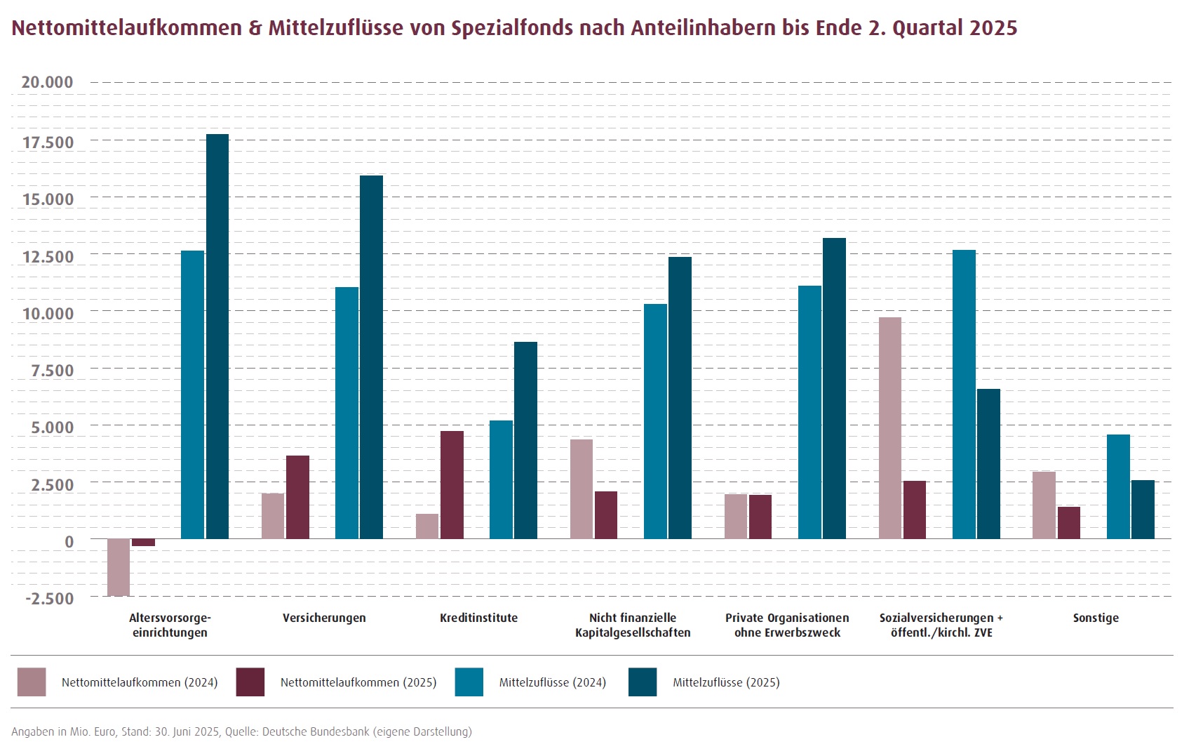 Per Ende Juni 2025 verzeichnen Spezialfonds von Altersvorsorgeeinrichtungen Nettomittelabflüsse in Höhe von 285 Mio. Euro im laufenden Jahr. Versicherungen als zweitgrößte Investorengruppe weisen per Ende Juni 2025 ein Nettomittelaufkommen in Höhe von 3,6 Mrd. Euro auf. Kreditinstitute verzeichnen mit 4,7 Mrd. Euro per Ende Juni 2025 das höchste Nettomittelaufkommen in der deutschen institutionellen Investorenlandschaft. Fazit: Kreditinstitute und Versicherungen prägen das Nettoneugeschäft des laufenden Jahres. Auf recht niedrigem Niveau, wohlbemerkt.