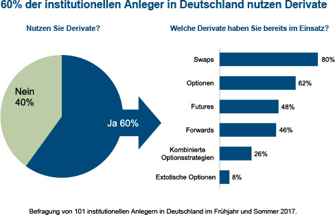Den Stellenwert dieser Erkenntnisse für Investoren unterstreicht auch Alexander Schindler, im Vorstand von Union Investment zuständig für institutionelle Kunden: „Im aktuellen Kapitalmarktumfeld können Investoren auf alternative Investmentkonzepte nicht mehr verzichten. Viele dieser Strategien benötigen zur Umsetzung allerdings Derivate wie etwa Optionen, Futures oder Swaps.“