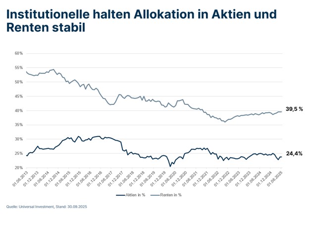 Wie spiegeln sich diese Einschätzungen in den Portfolios institutioneller Anleger wider? Auf der Plattform von Universal Investment sind die Allokationen in den letzten Monaten stabil geblieben (siehe folgende Abbildung). So waren Ende September 39,5% des institutionellen Gesamtvermögens von 643,3 Mrd. Euro in Rentenpapieren angelegt – unverändert gegenüber dem Stand zum Halbjahr und minimal höher als Ende September 2024 (39,0%). Der Aktienanteil ist mit 24,4% über den Sommer leicht um 0,66 Prozentpunkte gestiegen, im Vergleich zum Vorjahreswert jedoch auf demselben Niveau. Grund für diese Schwankungen dürfte ein regelmäßiges Rebalancing und Abschöpfen von Kursgewinnen sein.
