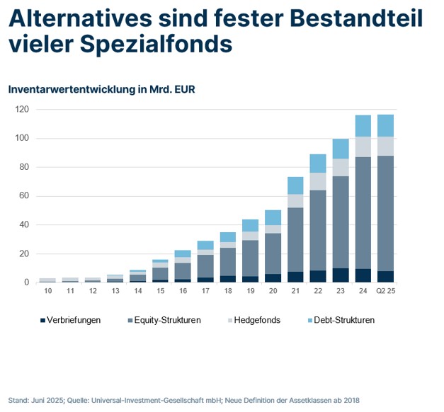 Dass auch Alternative Investments längst ihren festen Platz in den Portfolios erobert haben, ist an ihrem Volumen zu erkennen: Zum Ende des zweiten Quartals – den letzten verfügbaren Daten – lag dies bei 116,7 Mrd. Euro (siehe folgende Abbildung). In erster Linie wählen Anleger Equity-Strukturen, die fast zwei Drittel aller Fonds- und Verbriefungsstrukturen ausmachen, gefolgt von Debt mit einem weiteren Viertel. Der Rest ist auf Verbriefungen und Hedgefonds verteilt. Der stärkste Zuwachs auf der Alternatives-Plattform von Universal Investment war zwischen 2013 und 2015 zu beobachten. 2015 – dem bisherigen Peak – nahm das angelegte Kapital um 81% gegenüber 2014 auf rund 16 Mrd. Euro zu. Danach blieben die Zuflüsse weiter hoch, die Wachstumsraten haben sich jedoch inzwischen abgeschwächt. 2024 stieg das Alternatives-Vermögen noch um 16,8% gegenüber dem Vorjahr; im ersten Halbjahr 2025 betrug der Zuwachs dagegen „nur“ 387 Mio. Euro bzw. 0,3%.