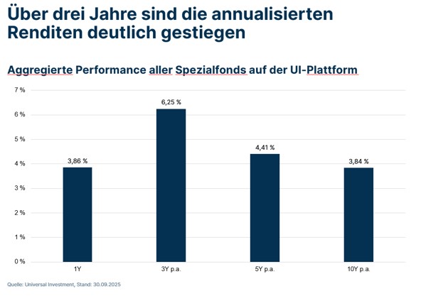 Methodik und Relevanz: Die Auswertung erfasst alle Anlagen in Spezialfonds bei Universal Investment für den Zeitraum Dezember 2011 bis zum 30. September 2025 und wird regelmäßig aktualisiert. Das Gesamtvolumen der analysierten Assets under Administration beträgt rund 643 Mrd. Euro.