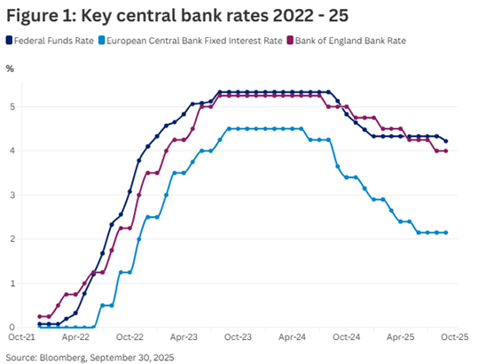 Die Zentralbanken haben bei der Bekämpfung der globalen Inflation spürbare Fortschritte erzielt. Vor diesem Hintergrund dürften die Leitzinsen zwar weiter gesenkt werden, insgesamt aber auf einem Niveau bleiben, das etwas über dem von vor der Pandemie liegt – insbesondere in den Industrieländern. Die Fed und die Bank of England werden ihre Zinsen voraussichtlich weiter senken, während die Richtung der Europäischen Zentralbank, die bereits früher mit Lockerungen begonnen hat, weniger eindeutig ist. Im Euroraum liegt die Inflation nahe dem Zielwert der EZB von 2% doch die weitere Entwicklung bleibt angesichts globaler Handelskonflikte und geopolitischer Spannungen unsicher.