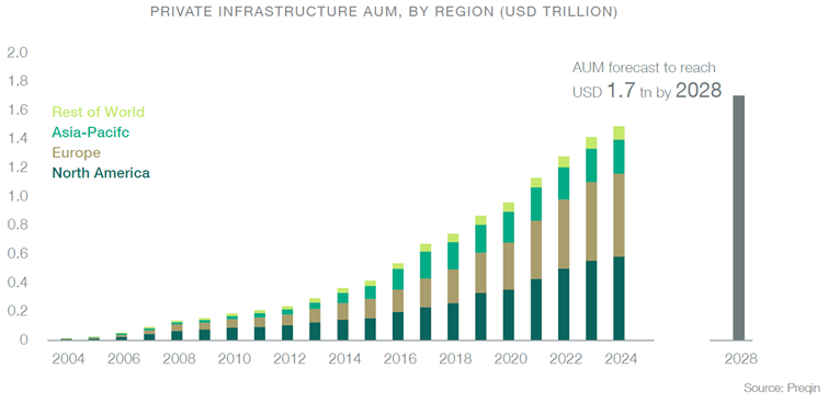 Die globale, nicht börsennotierte Infrastruktur wird voraussichtlich ihren Wachstumskurs fortsetzen und bis 2028 ein Volumen von 1,7 Billionen US-Dollar erreichen.