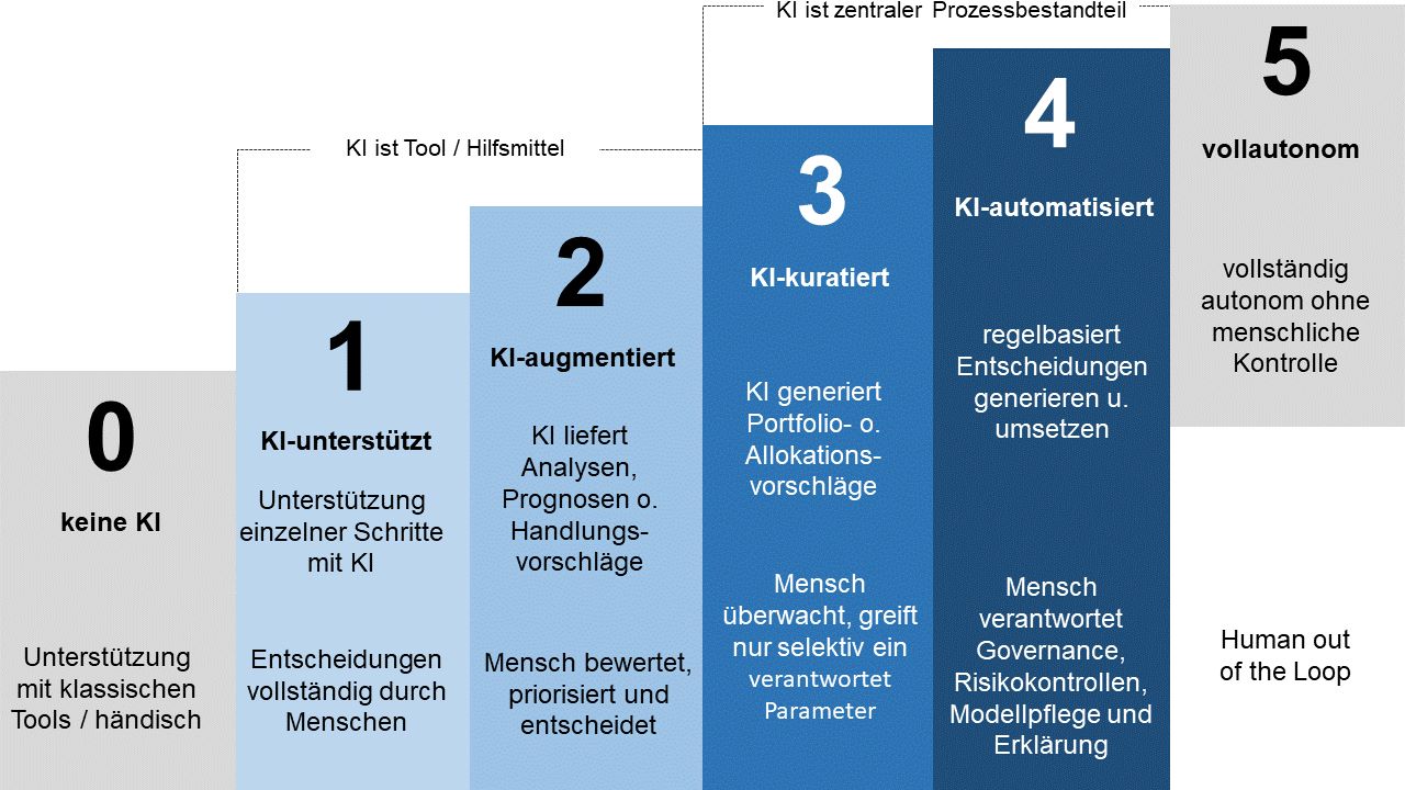 5. Vollautonomer Einsatz: Investmententscheidungen erfolgen vollständig autonom ohne menschliche Kontrolle. Diese Stufe bildet den theoretischen Endpunkt des Spektrums, ist jedoch im regulierten Asset Management weder zulässig noch von Investoren akzeptiert.