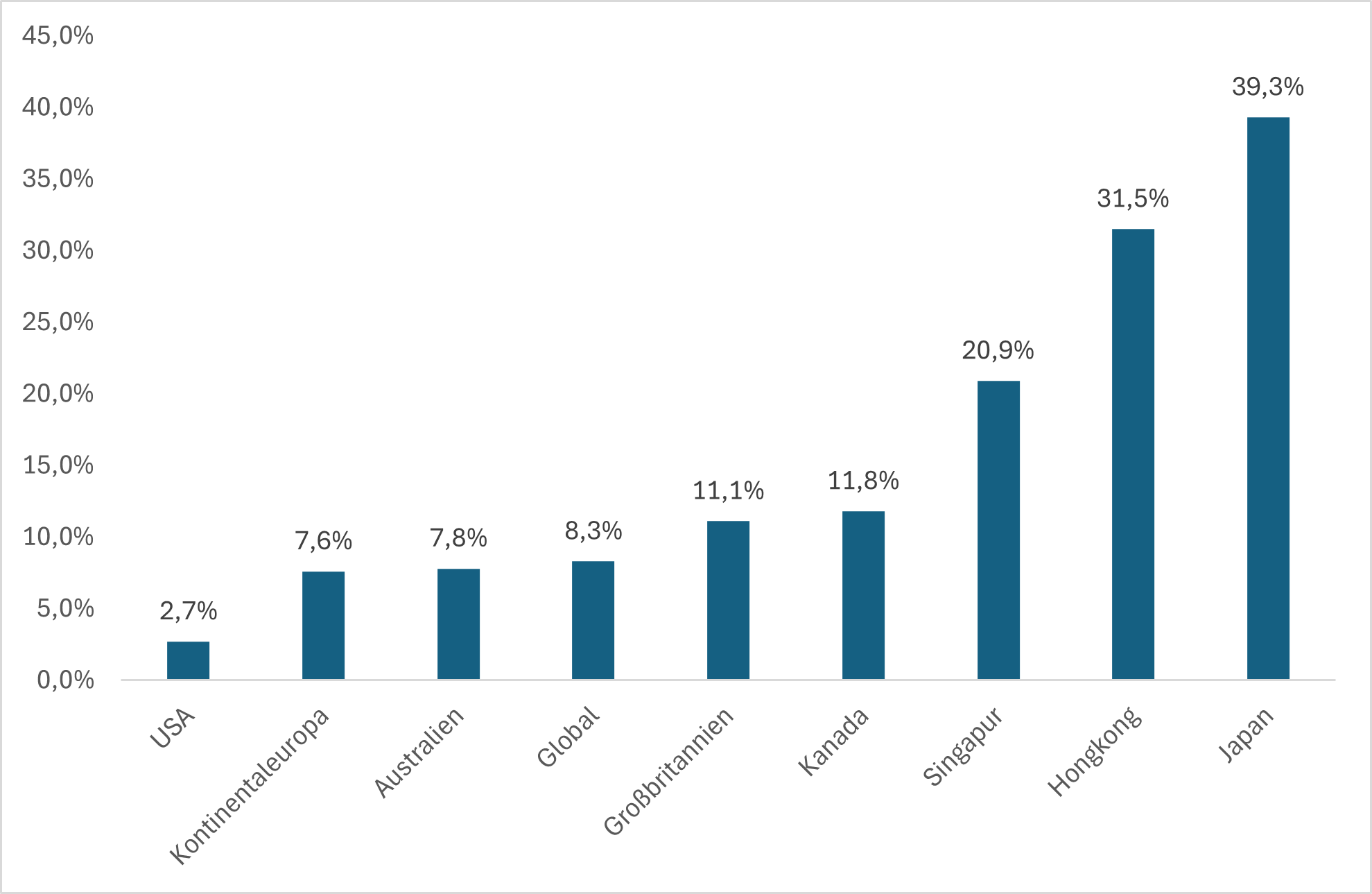 Asien lag 2025 mit Renditen zwischen knapp 21% und fast 40% an der Spitze, die USA mit unter 3% am Ende (sh. Abb. 1). Kontinentaleuropa blieb mit einem Wachstum von 7,6% leicht hinter den Erwartungen zurück. Deutschland und Schweden gehörten mit einem Rückgang von 13,4% (in Euro) bzw. 8,6% (in SEK) zu den größten Negativfaktoren.